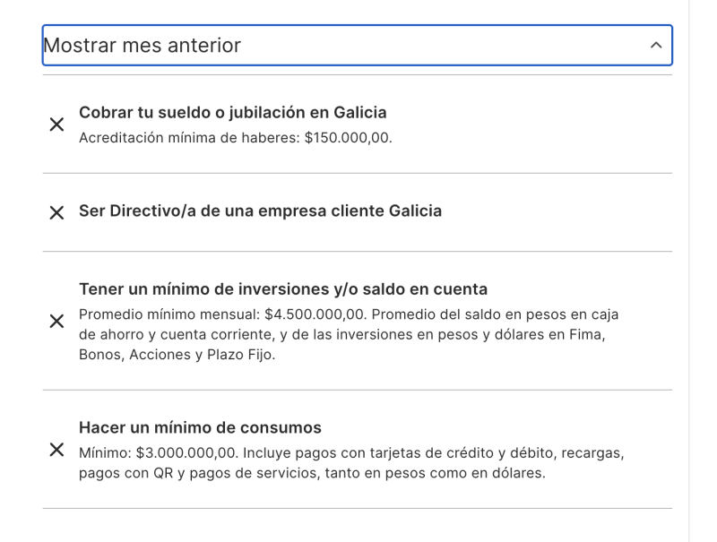 El Galicia tiene de bueno que es transparente sobre el tema, y te muestra en un sector (medio escondido) del homebanking los criterios para bonificar, y como venís con el objetivo. En mi caso, lo bonifico con tenencia de inversiones (unos bonos que igualmente en algún lado los tengo que tener). Aprovecho a coincidir con que PIX es un choreo, principalmente porque pagar con PIX es pagar con dólares CCL, mientras que con la tarjeta son dólares MEP, que cotizan más bajo; esto vale para cualquier banco o billetera que uses.