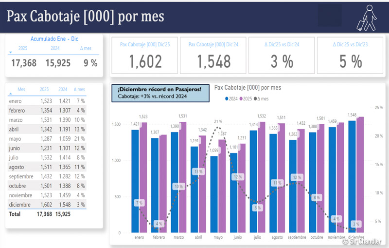 Por el lado de cabotaje se terminó con 1,6 millones de pasajeros, una mejora del 3% con respecto a 2024 y del 5% con respecto a 2023. Si lo medimos contra el 2019 es un 17% arriba.