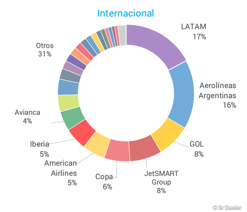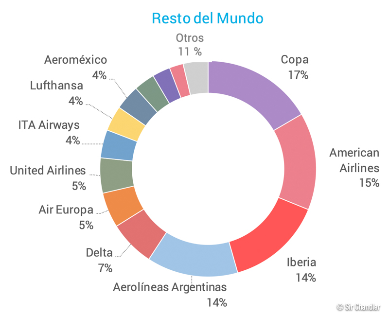 Pero fuera de Sudamérica vemos el peso de COPA que logró el primer puesto y Aerolíneas Argentinas ahora está en el cuarto lugar. Todos los de arriba aumentaron frecuencias, son más aviones, que Aerolíneas por ahora no tiene.