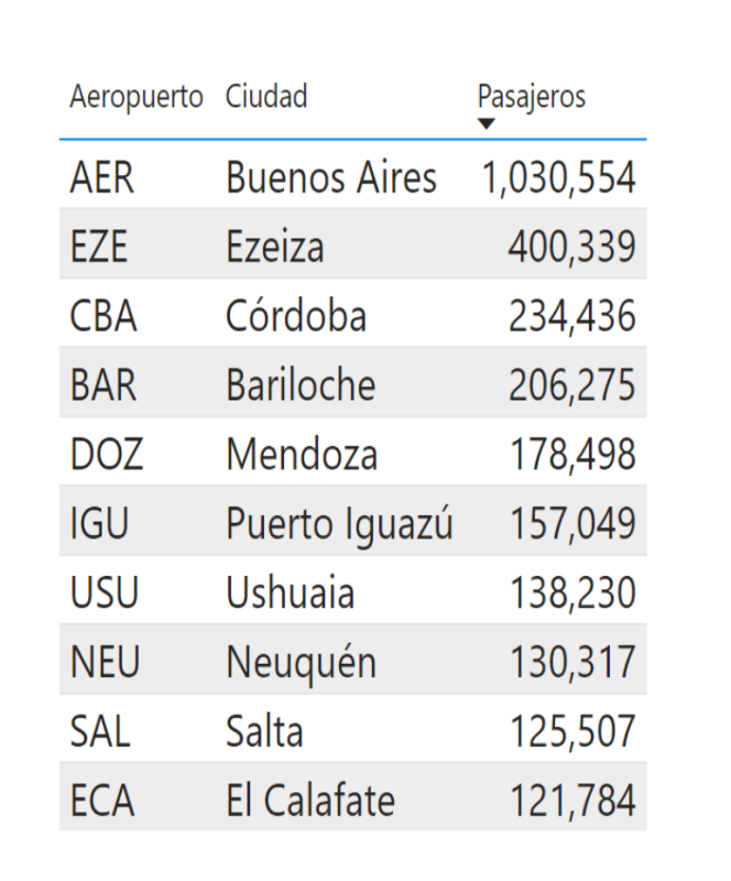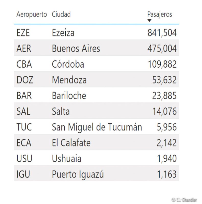 Aeropuertos ordenados por los pasajeros internacionales de diciembre, con Ezeiza casi duplicando a Aeroparque. En enero debería aparecer Rosario nuevamente