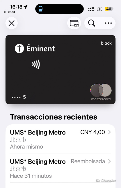 En mi tramo de regreso probé si podía pagar directo con la tarjeta en el celular, porque lo decía en algunos carteles y pude. Acá se ve en las transacciones un cobre y antes una anulación. Porque el sistema cobra la tarifa máxima y luego al salir, que se apoya nuevamente, cobra lo REALMENTE USADO. Por eso anula el cobro anterior