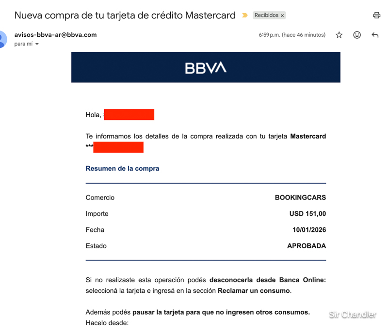 Hice la reserva en bookingcars, pongo la mastercard BBVA para pagar y chan… DENEGADO. El sitio de bookingcars recomendando que me comunique con el banco pero al toque entra mail e indica que detectaron una compra inusual. Si… puede ser que nunca la haya usado a esa tarjeta en Bookingcars ya que normalmente usaba la Visa del BBVA