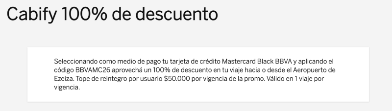 promoción válida para compras con tarjetas mastercard black emitidas por bbva. las compras pueden realizarse únicamente con tarjeta de crédito mastercard y para obtener el descuento se debe aplicar el código BBVAMC26 en la aplicación de cabify. válido en un viaje por vigencia exclusivamente con destino aeropuerto de ezeiza o desde aeropuerto de ezeiza. la presente promoción es válida sólo para consumos de tipo familiar, y no se acumula a otras promociones. en el caso de duda sobre el destino del consumo. la promoción no aplica a pagos realizados a través de otras billeteras virtuales y/o plataformas de pago online (por ejemplo, paypal, todo pago, mercado pago, ualá, etc.). el descuento se vera reflejado en la aplicación de cabify. los accionistas de banco bbva argentina s.a. limitan su responsabilidad a la integración de las acciones suscriptas ley 19.550 y ley 25.738 cuit 30-50000319-3. avda.córdoba 111- piso 31 caba – cp c1054aaa
