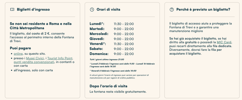 El ticket de dos euros da derecho a situarse en el área más cercana a la fuente, permitiendo observar de cerca sus relieves y esculturas, y, cómo no, lanzar la tradicional moneda al agua. El horario de acceso con entrada abarca de 9:00 a 22:00, lo que asegura una amplia franja diaria para planificar la visita. Fuera de esta franja, la zona permanece cerrada al público o solo accesible desde la distancia. Esta medida busca evitar las aglomeraciones que, en ocasiones, hacían difícil disfrutar del monumento en condiciones óptimas. La entrada, además, no es nominativa ni requiere reserva para un día específico, facilitando la planificación para quienes viajan con agenda flexible.