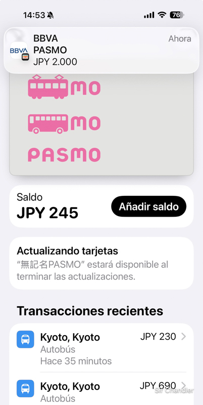 En Kioto también nos movimos con la PASMO, que podía cargarla para pagar por los cuatro AL BAJAR de los buses. Esa la capturé porque la pude pagar con la Master del BBVA luego de autorizar «compras inusuales» ese día por la app