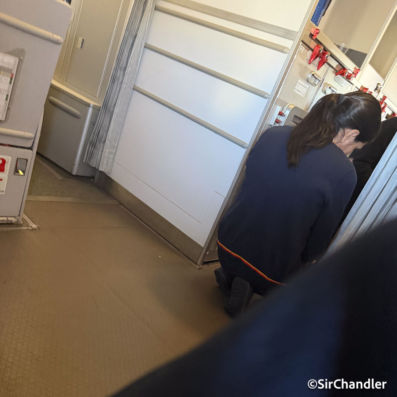 Una pasajera andaba medio descompuesta y estaba en el galley. Bien los tripulantes para poder «levantarla» con consejos y asistiéndola. Igualmente se puede ver en el video no bajó nadie hasta que la bajaron a ella