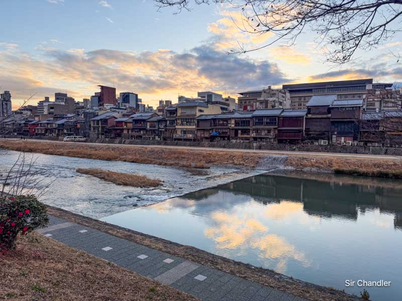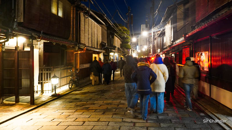 El de las geishas tuvo un punto de encuentro en el atardecer así estaba el cielo y ese barrio de construcciones clásicas de Kioto, con muchas casas de madera que tienen un frente reducido y una gran profundidad, porque nos contaron que en su momento el impuesto caía sobre el tamaño precisamente del frente y no del resto