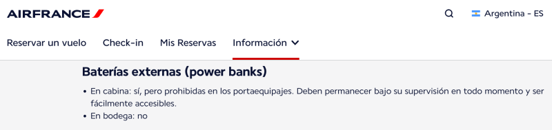 También comentaron que Air France los había prohibido por el uso, pero en la web no dice nada al respecto. Sólo que no pueden ir arriba en el maletero, o en mochila o en el bolsillo del asiento.