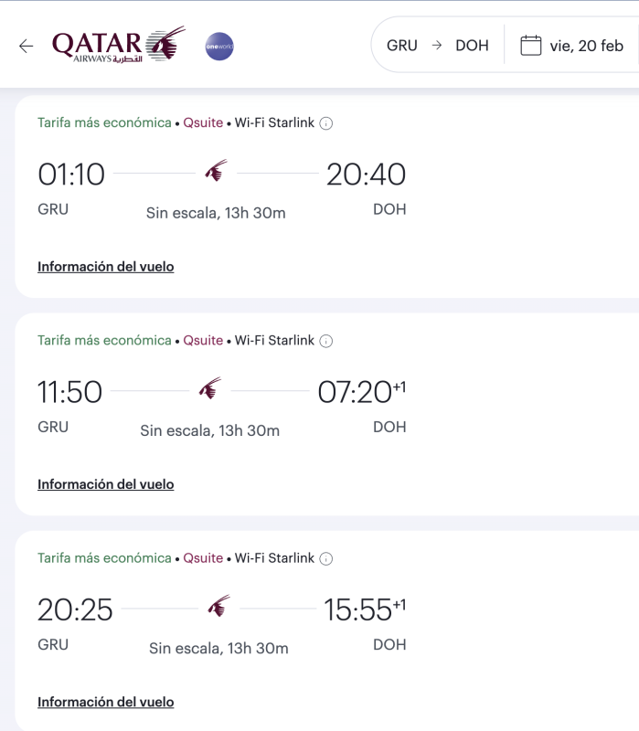 Desde esta semana Qatar tendrá tres vuelos diarios con Guarulhos, el principal aeropuerto de San Pablo desde Doha lógicamente.