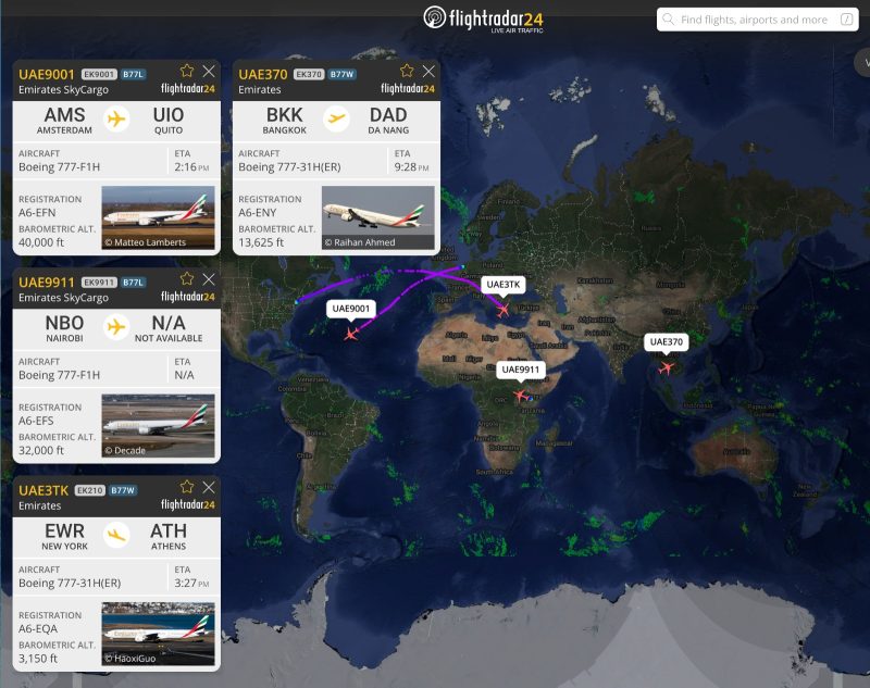 En el momento de hacer este post si en FR24 busco los aviones en el aire de Emirates, muestra que sólo hay 4, siendo 2 de ellos cargueros. Uno de los de pasajeros salió de New York y estaría aterrizando en Atenas.
