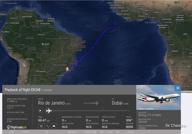 Ayer el vuelo de Emirates, el EK248 que hace Ezeiza Río de Janeiro Dubai volvió a Brasil casi al estar sobre África