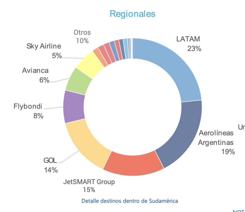 Pero si vamos sólo a los regionales, que miden SUDAMERICA con destino/origen directo de los vuelos Latam logra el 23%, Aerolíneas el 19% y Jetsmart el 15% que es notable que le gane a GOL