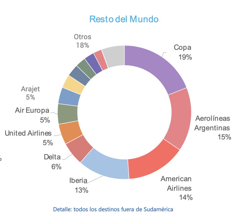 Ahora por RESTO DEL MUNDO, es decir fuera de Sudamérica y casi dentro del área para el tiro libre… COPA gana con un aplastante 19% la torta. Aerolíneas le sigue con el 15% y muy cerca American con el 14%. Notable que Arajet haya llegado al 5%, lo mismo que Air Europa o United