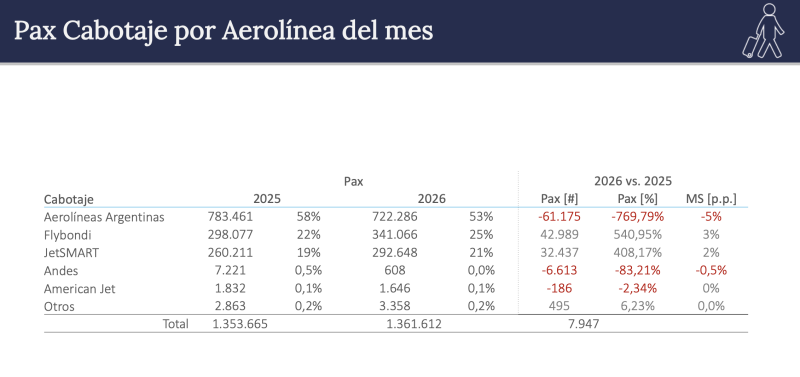 Acá lo que digo de Flybondi que creció en pasajeros pese a todo, logrando un 25% de la torta. Mejoró 3 puntos contra el año pasado, pero eso no se podrá ver en marzo. Aerolíneas movió menos pasajeros y perdió 5 puntos