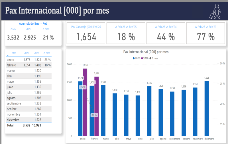 Pasajeros internacionales también quedaron arriba con 1.654.000 y fue una mejora del 18% en un año, 44% en dos y 77% en tres. Contra 2019 la mejora fue del 26%