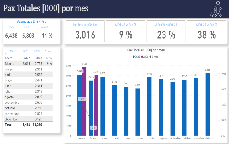 Total total, tenemos más de 3 millones de pasajeros y una mejora del 9% en un año, 23% en dos y 38% en tres. Contra 2019 es una mejora del 17%