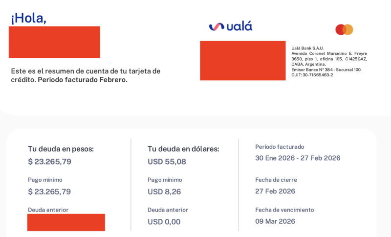 En mi caso el resumen de Ualá cerró el 27/2 y vence el 9/3. A favor tiene muchos más días que el de Mercado Pago entre cierre y vencimiento. En contra… no se porque tarda tanto en generarse ya que el resumen me llegó el 2/3 recién, siendo que MP lo hace de un día para el otro y NX casi lo mismo (cierra el 27 y el 28 a la noche lo veo)