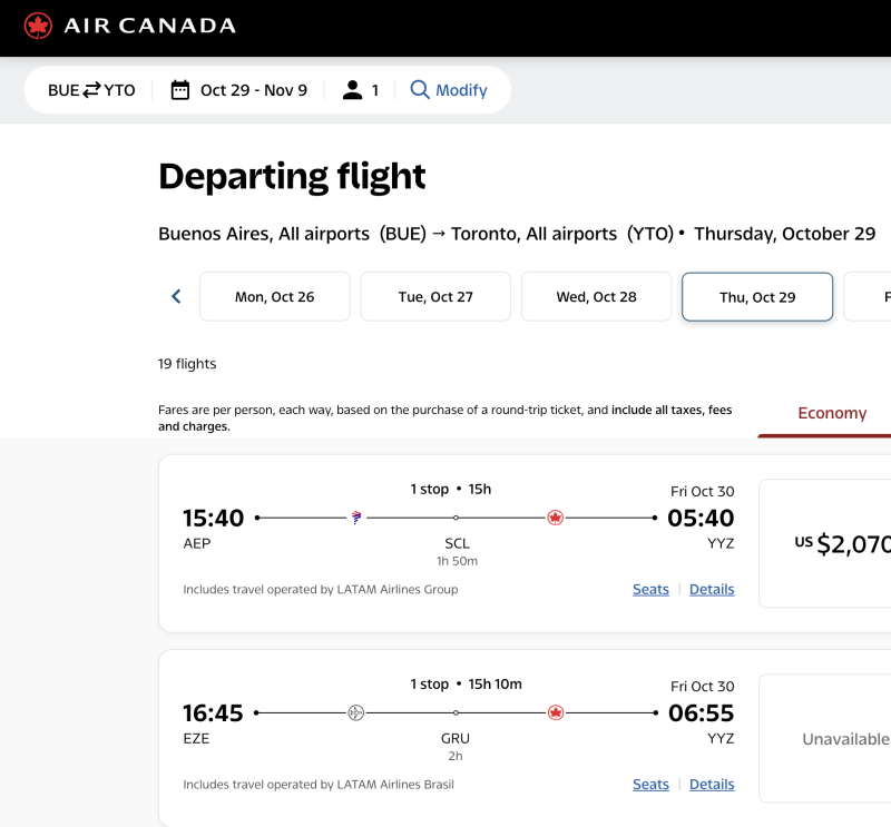 Si hoy alguien busca pasajes por Air Canada aparecen las opciones de llegar o volver de Canadá vía San Pablo, pero no con ese primer tramo con ellos como es habitual. Lo combinan con los vuelos de LATAM por lo que pueden ser vía AEROPARQUE o vía el mismo EZEIZA: