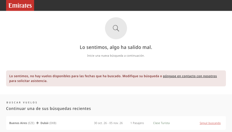 Emirates en tanto te dice que LO SENTIMOS, ALGO HA SALIDO MAL
