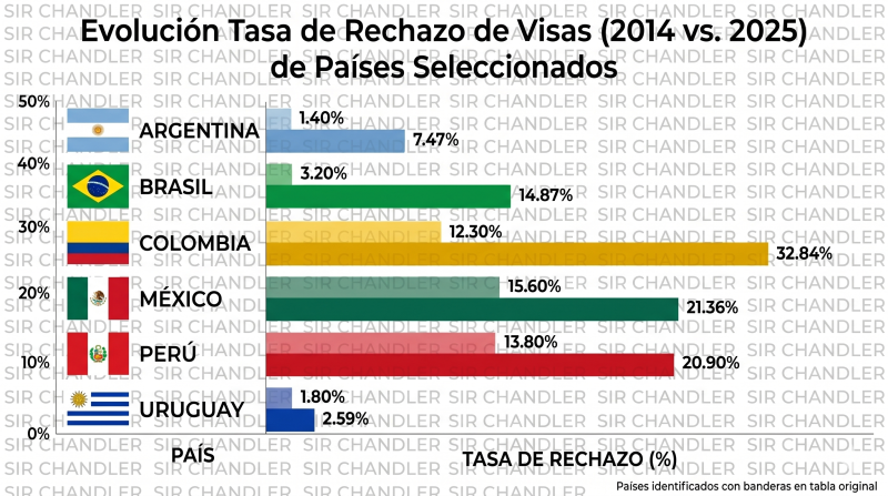 El «Efecto Pandemia» (2020): Se observa un pico drástico de rechazos en casi todos los países (especialmente Colombia con un 46,82% y Brasil con 23,16%), probablemente por las restricciones de viaje y cierres de consulados.
