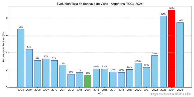 A priori no es un número alto, pero si consideramos el historial de la Argentina si lo es. El mejor año fue el 2014 con sólo el 1,4% de rechazos. El peor año fue el 2024 con un 8,9%. Se bajó casi un punto y medio en un año, pero es más del doble del 2022 y más del triple del 2019