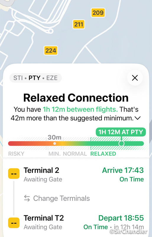 Según FLIGHTY el tiempo ideal es una hora. En este ejemplo tengo 1:12H y me dice que es RELAJADO. Tiempo RIESGOSO menos de 30 minutos, cosa que no pasa en otros aeropuertos. Y más de 42 minutos es lo recomendado