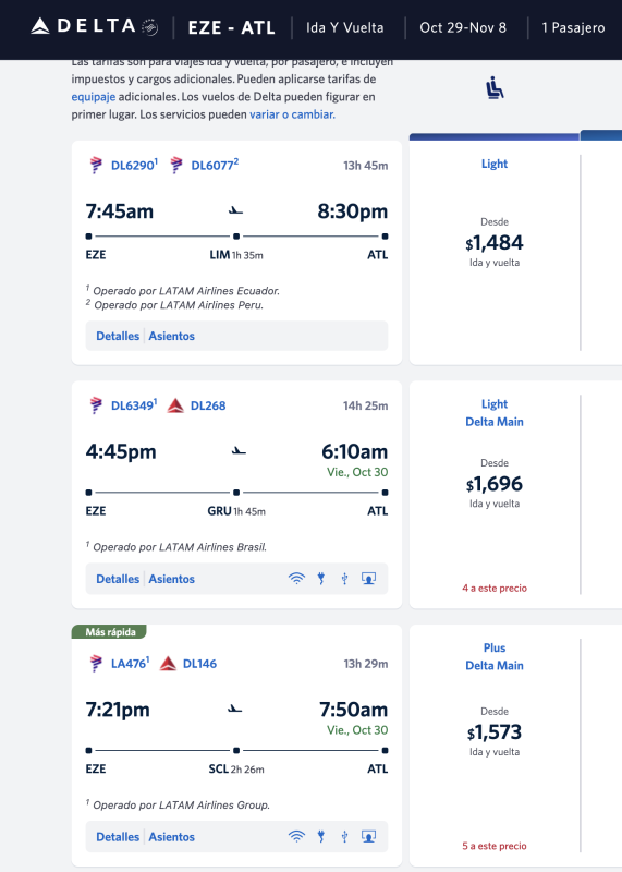 Tal como ayer se vio en el sitio de United, en el de Delta ya se dejaron de ofrecer lo vuelos directos entre Ezeiza y Atlanta en los días en el que la pista principal de Ezeiza tendrá restricciones operativas por quedar más corta que la de Aeroparque.