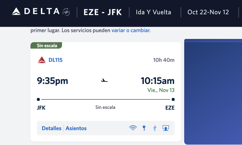 El vuelo con el JFK de nueva York estaba comenzando a fines de octubre normalmente y también se ve afectado, pero acá se ve que el 12 de noviembre está ya el vuelo de bajada activo, por lo que también vuelve normalmente una vez que se termina el tema de la pista