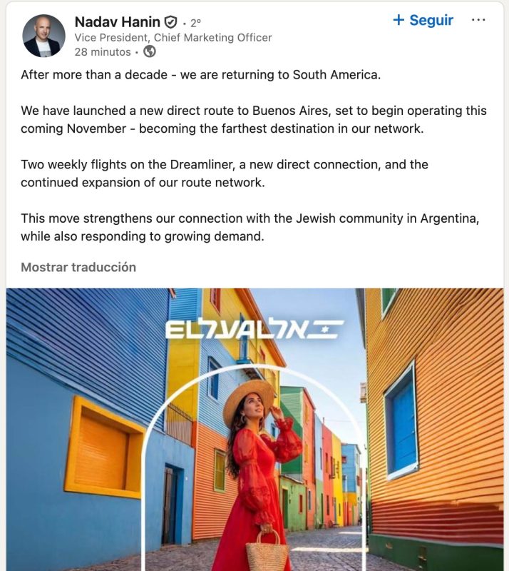 Tras más de una década, regresamos a Sudamérica y lanzamos un vuelo sin escalas a Buenos Aires, Argentina. Operaremos dos vuelos semanales utilizando nuestra nueva y avanzada aeronave Dreamliner, con tres clases de servicio: Económica, Premium y Business. La duración del vuelo se espera que sea de aproximadamente 16,5 horas hacia el exterior desde Israel y 15,5 horas en el regreso. La venta de boletos para esta ruta se espera que comience durante el mes de mayo. A través de nuestro socio de codeshare Aerolíneas Argentinas, así como de asociaciones adicionales, ofreceremos vuelos de continuación a puertas de entrada en todo el continente desde Buenos Aires, junto con conexiones a otros destinos en Sudamérica a través de una variedad de puertas de entrada europeas. Este es un paso significativo para fortalecer la conexión entre Israel y Sudamérica, particularmente con la comunidad judía en Argentina, que es la quinta más grande del mundo y actualmente la más grande sin vuelos directos a Israel.