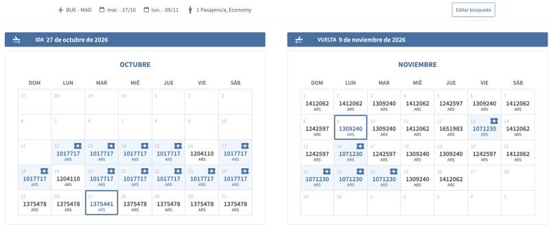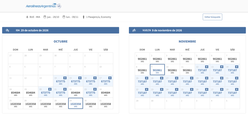 ¿Qué hará Aerolíneas? Aun no lo sabemos, pero observando el sitio de ventas curiosamente las tarifas de esas semanas subieron, pero no de manera notable, posiblemente sea por la demanda. En este captura de precios de su web con destino Miami se ve como las tarifas que rodean a las dos semanas de restricciones (del 25 de octubre al 11 de noviembre) tienen las tarifas más bajas, seguramente por menos demanda