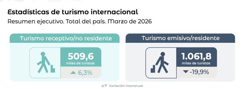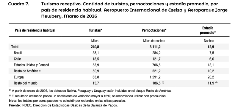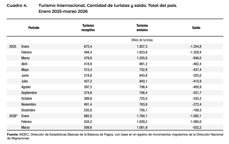 En este cuadro se ve que este año, con los tres meses medidos, muestra lo mismo en los dos lados pero se acentuó en marzo la caída del turismo emisivo, los argentinos que salen. Pero se puede ver que el «saldo» de marzo 2026 fue de 552.000 pasajeros NEGATIVO, mientras que el del año pasado llegaba a 846.000