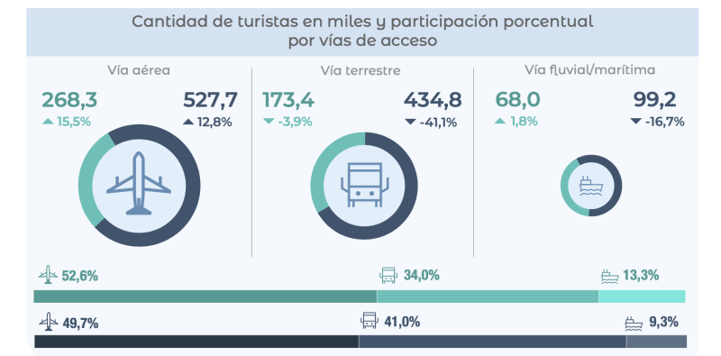 El movimiento se dio mayormente por avión con un crecimiento en los dos números que se miden. Pero donde se perdió fuerte de la salida es con los que se vueron por vía terrestre y también fluvial. Los extranjeros sólo perdieron por vía terrestre