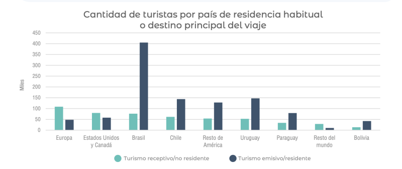 Brasil sigue siendo el principal destino de los argentinos, segundo se ve a Uruguay y tercero a Chile. Pero eso es muy distinto en los que vienen porque el número uno es Europa, el segundo Estados Unidos y Canadá y tercero es Brasil