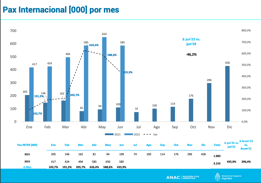 En junio 2022 hubo 585.000 pasajeros internacionales volando con distintos aeropuertos de la Argentina. Esto...